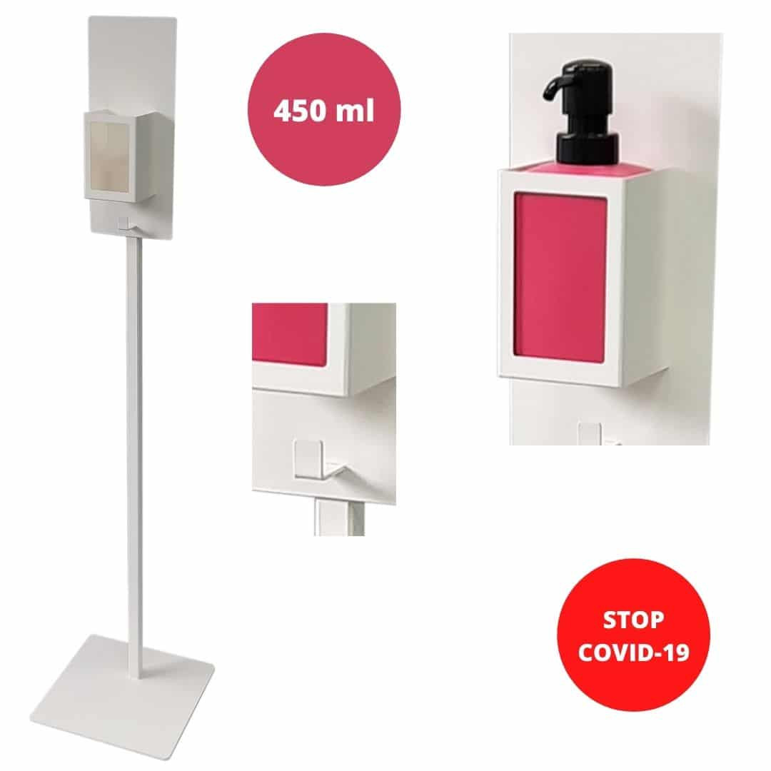 Stojalo je narejeno iz prašno lakiranega jekla in je zasnovano tako, da je trajno in funkcionalno. Hitra in enostavna montaža ter majhnost omogočata njegovo namestitev kjerkoli v vašem podjetju. Komplet univerzalnega dozirnika in ročaja vam bo omogočil, da stojalo enostavno dopolnite z zaščitnimi sredstvi in razkužilom za roke, ki so na voljo na trgu.
