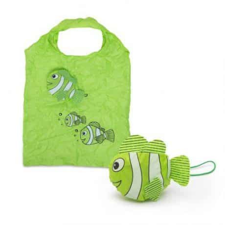 Močna in vzdržljiva nakupovalna torba, ki se lahko zloži v ribo, ki se s pomočjo obešala lahko obesi na nahrbtnik ali torbo. Narejena je iz organske, reciklirane plastike.
