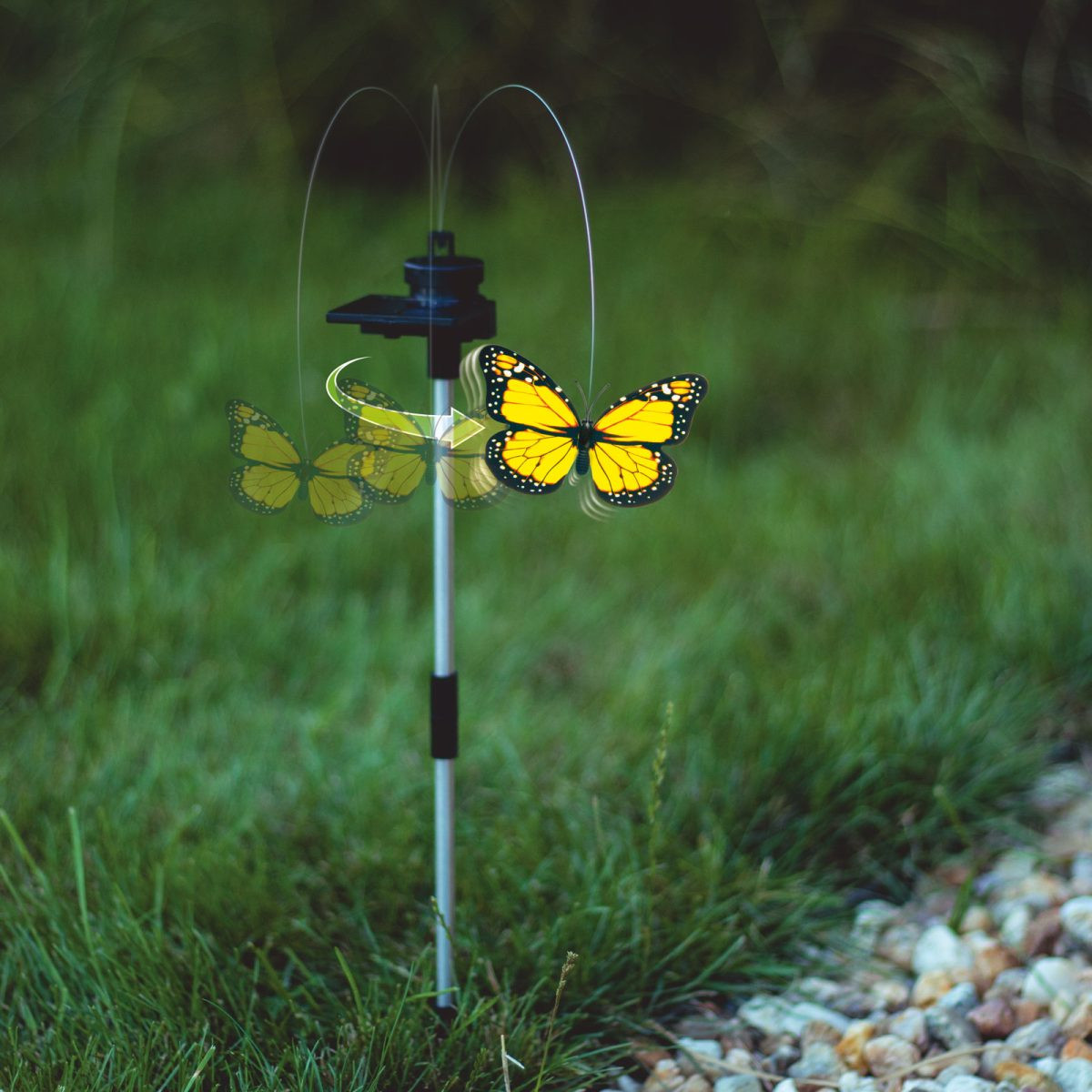 Leteči, plesoči sončni metulj je idealen za vsak vrt, balkon, gredico ali teraso. Metulj se premika tudi, ko je sonca malo. Izdelek ne vsebuje baterije, zato deluje le ob dnevni svetlobi zaradi energije sonca. Konica omogoča enostavno in hitro namestitev, priporočamo, da za izdelek izberete sončno mesto.