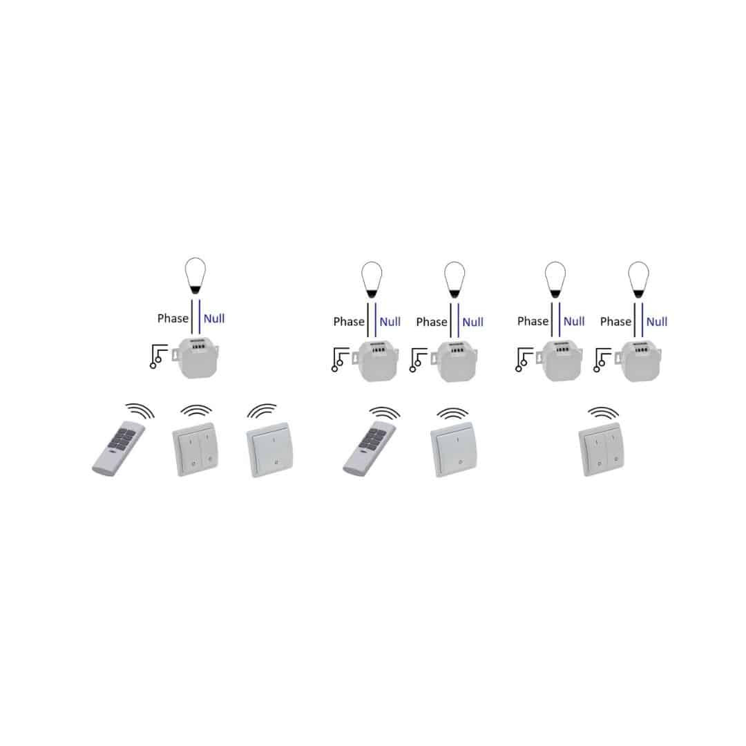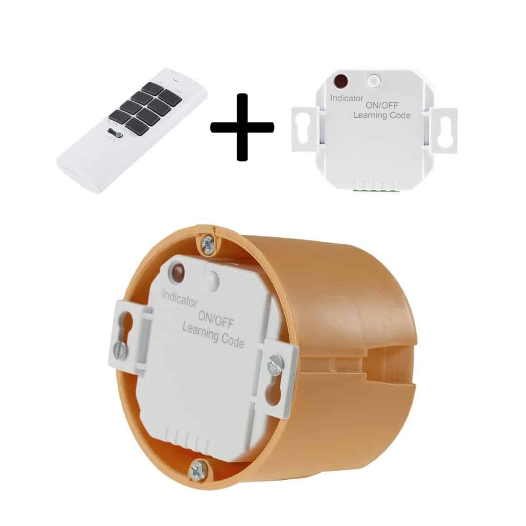 Praktični začetni komplet, sestavljen iz 1x radijskega daljinskega upravljalnika in 1x radijskega sprejemnika za podometno montažo. Komplet vam omogoča priročno preklapljanje vtičnic, svetilk ali luči z daljinskim upravljalnikom ali brezžičnim stikalom. Idealno za vgradnjo v spuščene strope ali za naknadno vgradnjo v podoometno dozo. Zahvaljujoč majhnim dimenzijam se sprejemnik prilega standardnim dozam fi 60mm.