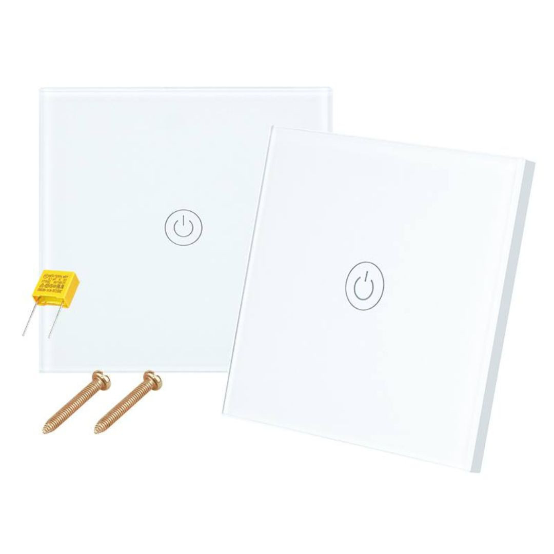 Komplet stopniščno stekleno stikalo na dotik + baterijsko stekleno stikalo (funkcija menjalnega stikala) enojno belo