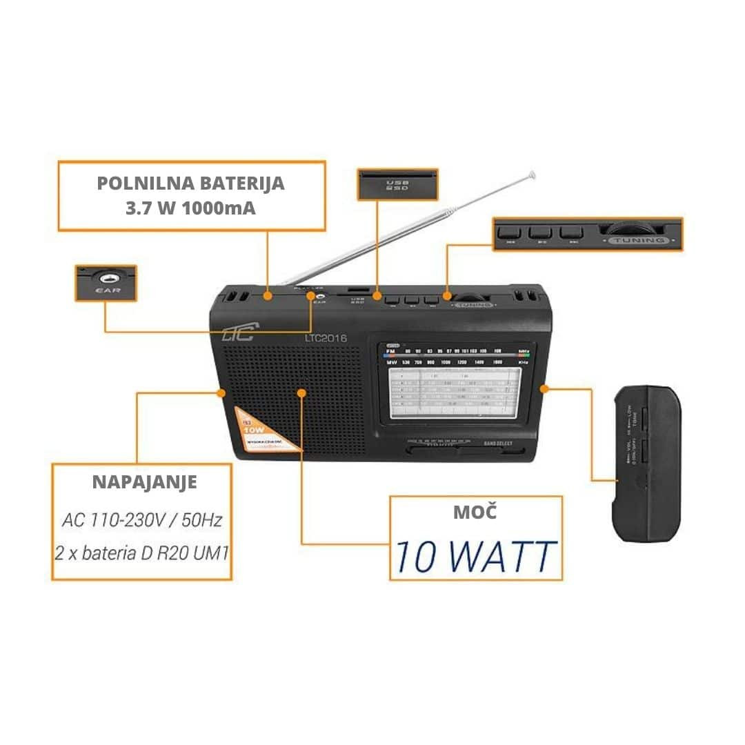 Visokokakovosten prenosni radio, ki je nepogrešljiv tako doma, kot v delavnici, na potovanju ali na delovnem mestu. Radio se lahko napaja neposredno iz omrežja 230 V, s pomočjo dveh R20 baterij ali vgrajene 1000 mAh polnilne baterije brez dodatnega vira energije.