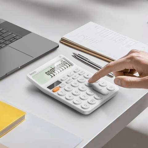 Elektronski kalkulator je praktična naprava za pisarniško in domačo uporabo, ki ima širok zaslon z 12-mestnim prikazom. Zahvaljujoč hibridnemu napajanju (baterija + sončna celica) je zanesljiv in energetsko učinkovit, zaradi kompaktne velikosti pa je idealen za vsakodnevno uporabo.