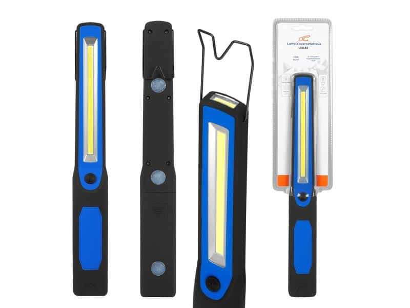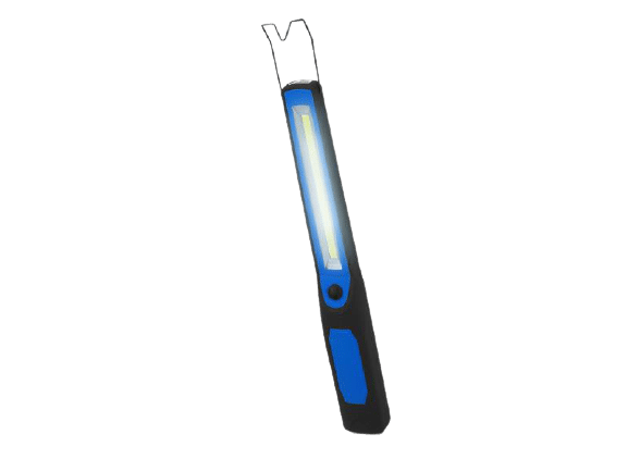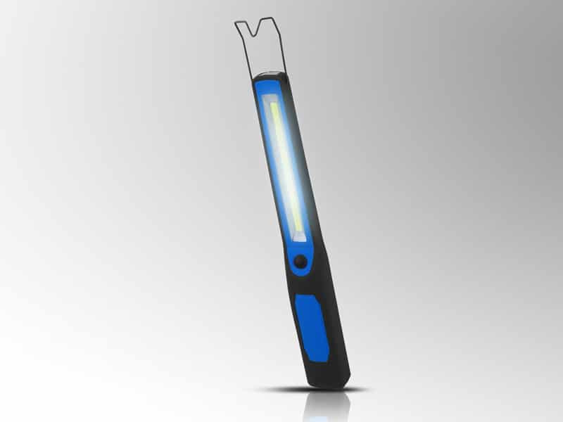 Kakovostna delovna svetilka, opremljena z magneti in kavljem, ki jo napajajo baterije AA.