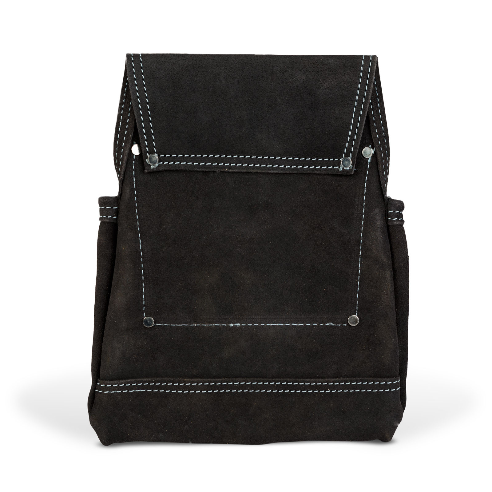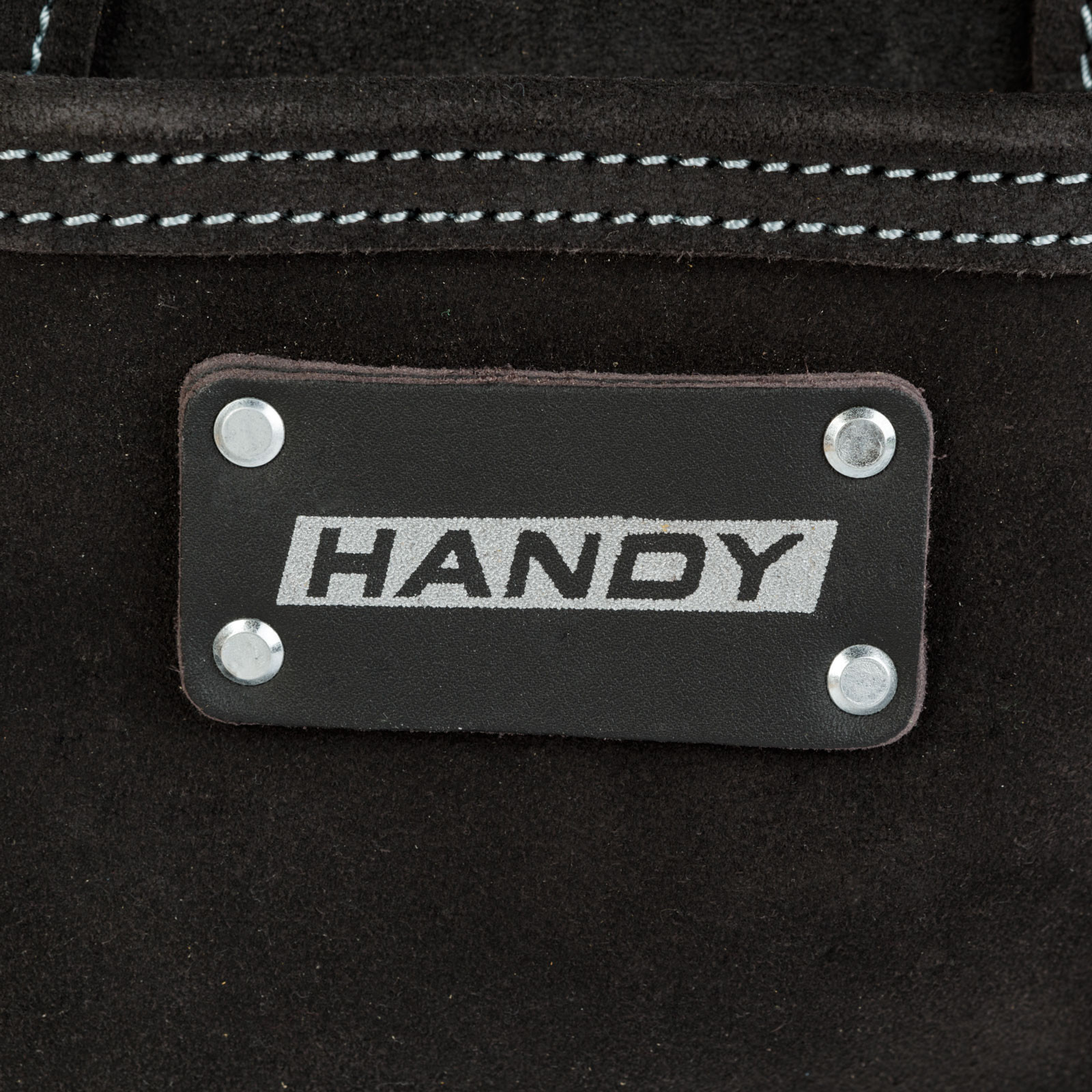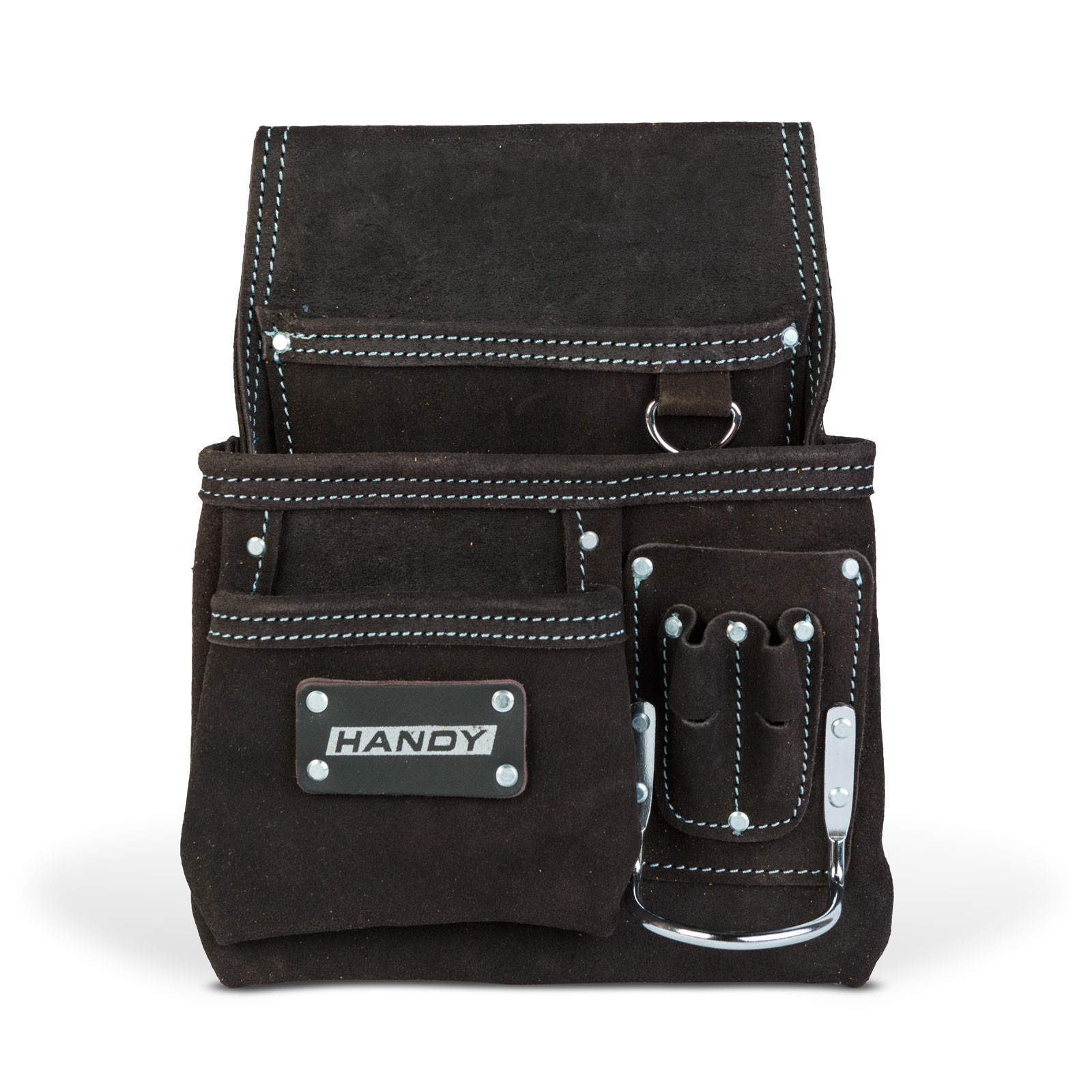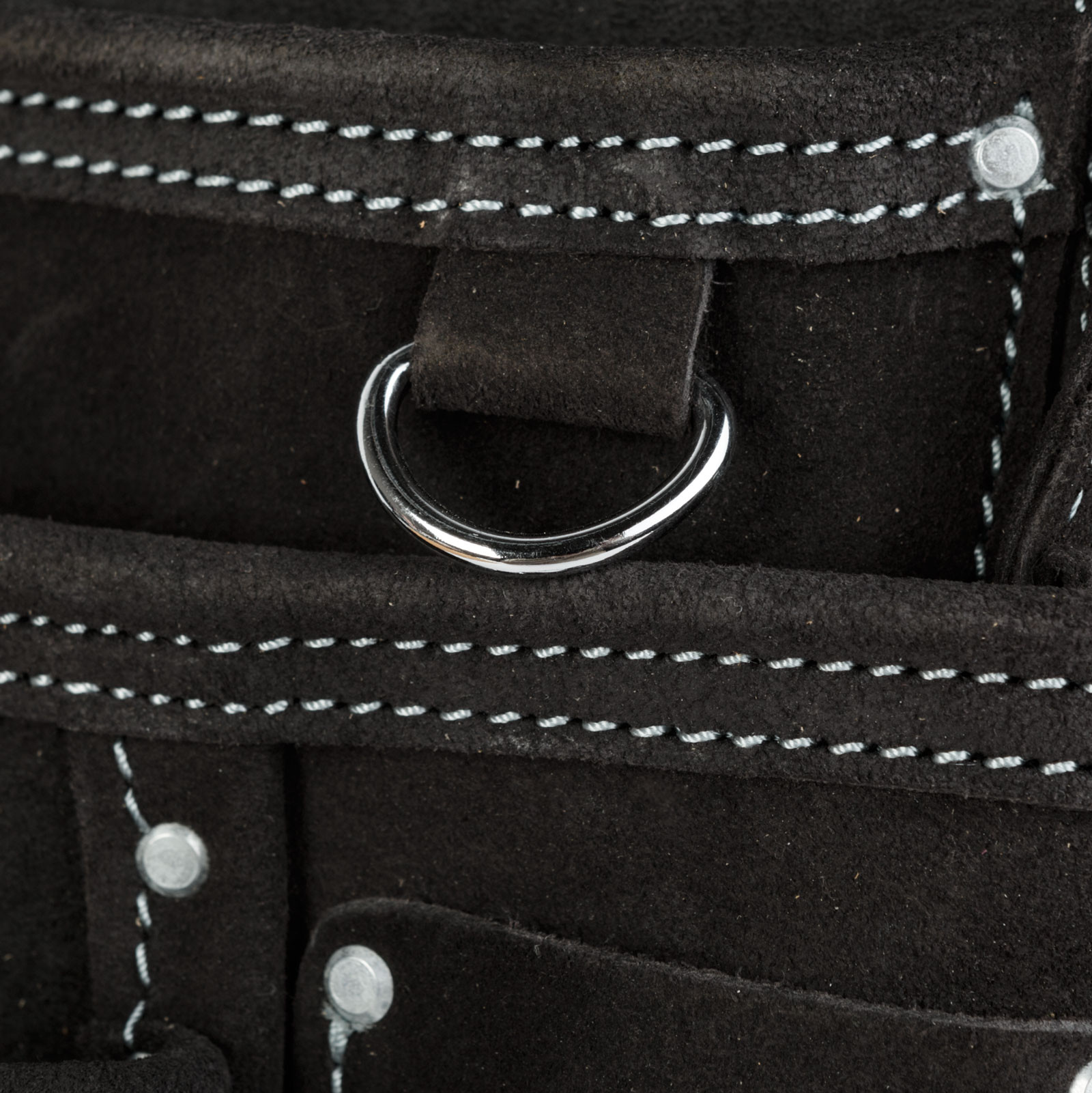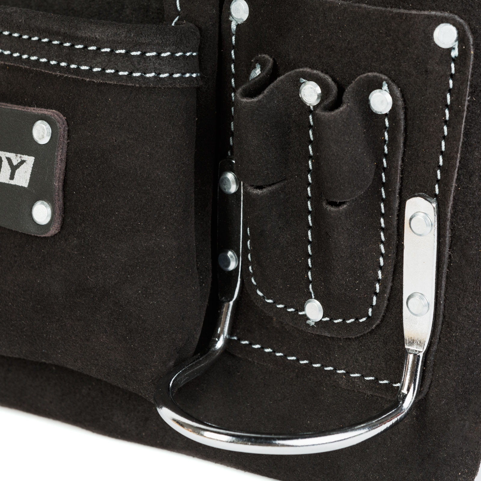 Torba za orodje za okoli pasu iz cepljenega usnja z dvema velikima žepoma, dvema zankama za obešanje, pasom in štirimi manjšimi predali (npr. za svinčnike). Trpežna konstrukcija, ojačana s kovinskimi zakovicami.